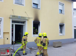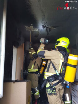 Ebenso war das Stiegenhaus des einstöckigen Wohnhauses stark verraucht. Da die Brandwohnung versperrt war und nicht bekannt war ob sich noch Personen in der betroffenen Wohnung befanden wurde unverzüglich mit der Öffnung der Türöffnung begonnen. Parallel dazu wurde die Bewohner der anderen Wohnungen ins Freie gebracht, ein Atemschutztrupp nahm einen Innenangriff in die Brandwohnung vor und ein Druckbelüfter wurde zum belüften des Stiegenhaus in Betrieb genommen.