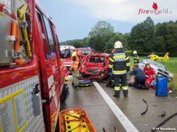 Durch den Aufprall wurden mehrere Personen zum Teil schwer verletzt. Ein Großaufgebot von Einsatzkräften machte sich auf den Weg zum Unfallort. Nach Eintreffen der Einsatzkräfte unterstützten umgehend Feuerwehrsanitäter die Sanitäter des Roten Kreuzes bei der Erstversorgung der zum Teil schwer verletzten Personen.
