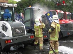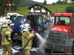 KIRCHDORF (TIROL): Am 23.07.2017 um 18.19 Uhr wurde die Feuerwehr Kirchdorf mittels Pager und Sirenenalarm mit dem Alarmstichwort „Brand Lkw“ alarmiert. Bei einem Bau & Landmaschinen Händler fing aus bisher unbekannter Ursache ein Radlader im Bereich des Motors zu brennen.