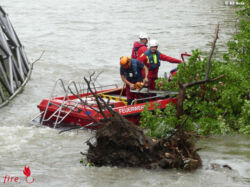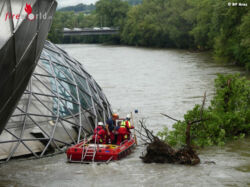 Ein etwa 20m langer ausgewurzelter Baum hat diese zuvor touchiert und ist bei einem Stein zwischen Murinsel und linkem Murufer hängen geblieben. Durch Einsatz der Baumschneidespezialisten der Höhenrettergruppe konnte der Baum vom Jetboot aus mittels großer Motorkettensäge zerkleinert werden.