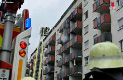 Ein weiterer Trupp ging über das Treppenhaus zur Brandbekämpfung in die Wohnung vor. An der Eingangstüre setzten die Feuerwehrleute einen Rauchschutzvorhang um eine Ausbreitung giftiger Dämpfe in den Treppenraum zu verhindern. Das Feuer auf dem Balkon konnte vom Atemschutztrupp im Drehleiterkorb von außen schnell abgelöscht werden. Der darüber liegende Balkon wurde ebenfalls durch das Feuer beschädigt. Da eine Fensterscheibe durch die Hitzeentwicklung geborsten war, brannten in dem Zimmer bereits die Möbel.