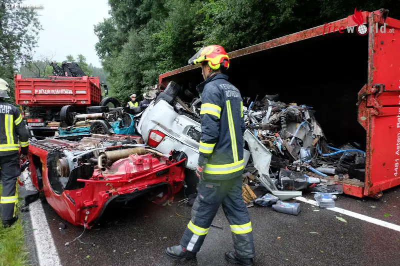 Um 10:32 Uhr erfolgte die Alarmierung der Feuerwehr Rohrbach im Mühlkreis."Die beim Eintreffen festgestellte Schadenslage ließ Schlimmes vermuten. Drei PKW am Dach, ein Lkw in Seitenlage – man musste von mehreren verletzten Personen ausgehen.", so der erste Eindruck der Feuerwehrkameraden. "Gott sei Dank waren die Autos am Dach keine Unfallfahrzeuge, sondern Schrottautos, die der verunfallte Lkw geladen hatte. Es befanden sich beim Eintreffen keine Personen mehr in einem Unfallfahrzeug" vervollständig Einsatzleiter OBI Christoph Nigl das Bild.