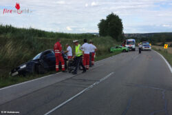 HOLLABRUNN (NÖ): Am späten Dienstagnachmittag, 25. Juli 2017, ereignete sich auf der Landesstraße 43, Hollabrunn Richtung Oberfellabrunn, ein Verkehrsunfall. Zwei Fahrzeuge kollidierten in einer Kurve und wurden in den Straßengraben geschleudert. Dabei wurde eine Person in ihrem Fahrzeug eingeschlossen.