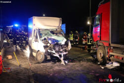 PETTENBACH (OÖ): Einen Schwerverletzten forderte in der Nacht auf Mittwoch, 26. Juli 2017, ein schwerer Unfall zwischen zwei LKW auf der Scharnsteiner Straße in Pettenbach (Bezirk Kirchdorf an der Krems).