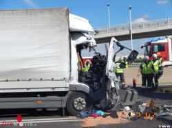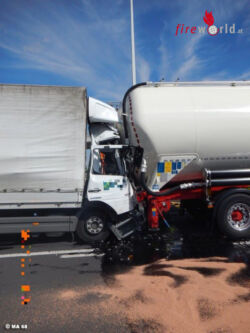 WIEN: In Folge eines Auffahrunfalls eines Lkw auf einen Sattel-Lkw mit Silo-Aufbau auf der S2 in Fahrtrichtung Süden wurde am Nachmittag des 25. Juli 2017 der Fahrer des aufgefahrenen Lastwagens massiv im Führerhaus eingeklemmt.