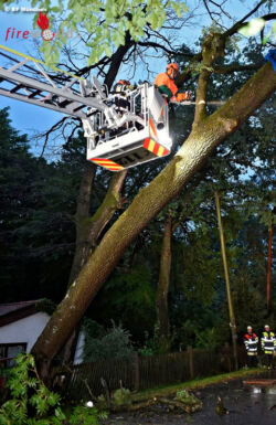 MÜNCHEN (BAYERN): Im Münchner Stadtteil Allach-Untermenzing hatte in den Abendstunden des 26. Juli 2017 ein Anwohner einen, in arger Schräglage befindlichen Baum bemerkt, und die Feuerwehr verständigt. Die rund 20 Meter hohe Esche hatte durch den aufgeweichten Boden der anhaltenden Regenfälle ihre Standfestigkeit verloren und drohte auf die Rudorffstraße zu stürzen.