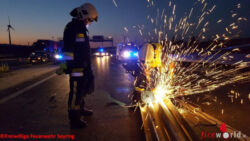 Drei nachkommende Pkw wurden ebenfalls beschädigt und waren fahruntüchtig. Der Lkw-Fahrer konnte sich selbst befreien und wurde leicht verletzt der Rettung übergeben. Nachdem ein zweifacher Brandschutz aufgebaut wurde, konnten die Einsatzkräfte damit beginnen, einen Pkw sicherzustellen sowie die Mittelleitschiene mittels Flex zu durchtrennen