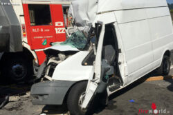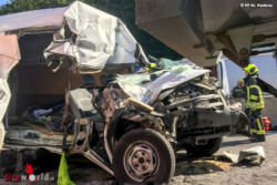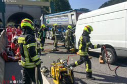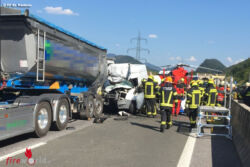 Das Lagebild für den Einsatzleiter zeigte, dass ein Kleintransporter auf einen Muldenkipper aufgefahren und der Lenker des Kleintransporters im Fahrzeug eingeklemmt war. Unter Verwendung von insgesamt drei hydraulischen Rettungsgeräten und immer unter Absprache mit dem Notarzt gelang es den Einsatzkräften, den Lenker nach 30 Minuten zu befreien. Der Schwerverletzte wurde mit dem Rettungshubschrauber Martin 3 in ein Krankenhaus geflogen. Im Bereich der Unfallstelle kam es auf der Autobahn zu massiven Verkehrsbehinderungen. Die Autobahnpolizei führt Erhebungen zur Unfallursache durch.