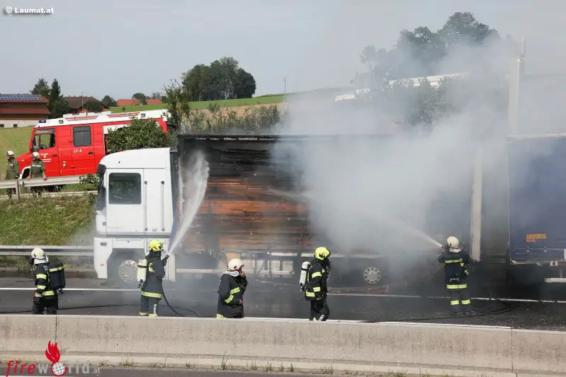 RIED IM TRAUNKREIS (OÖ): Fünf Feuerwehren standen Mittwochnachmittag, 2. August 2017, bei einem Lkw-Brand auf der Pyhrnautobahn bei Wartberg an der Krems (Bezirk Kirchdorf an der Krems) im Einsatz. Ein Lkw hatte in Fahrtrichtung Knoten Voralpenkreuz zu brennen begonnen.