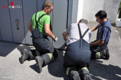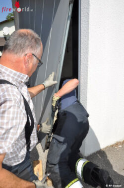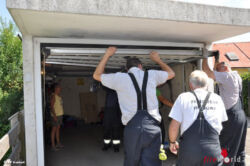 Eine Frau hatte sich in einer Fertigteilgarage eingeschlossen und konnte das Tor Aufgrund eines technischen Defekts nicht mehr öffnen. Seitens der Feuerwehr wurde das Tor seitlich etwas aufgedrückt, dadurch konnte eine Führungsschiene abgeschraubt und so die Öffnung weiter vergrößert werden. Ein Feuerwehrmann konnte dann im Inneren der Garage die Verriegelung lösen und das Tor öffnen. Nach ca. 15 Minuten war die Person befreit und konnte ihr „Gefängnis“ nach rund zwei Stunden Gefangenschaft endlich verlassen. Das Garagentor wurde anschließend außer Betrieb gesetzt.