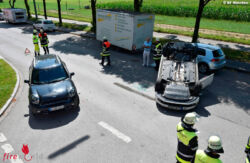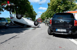 Auf Höhe der Sankt-Wendel-Straße kam es aus noch unbekannter Ursache zum Zusammenstoß mit einem VW Golf Variant. Dieser befuhr ebenfalls die Siemensallee in gleicher Richtung und stieß unvermindert in das Heck des MINI. Durch die Wucht des Aufpralls geriet der Golf ins Schleudern und kam schließlich auf dem Fahrzeugdach zum Liegen. Der 37-jährige Fahrer und seine 36-jährige Beifahrerin konnten sich selbst aus dem havarierten Fahrzeug befreien. Beide erlitten mittelschwere Verletzungen und kamen mit dem Rettungswagen in Münchner Krankenhäuser. Der Fahrer des MINI blieb unverletzt.