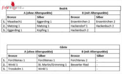Besonders hervorgetan haben sich dabei Feuerwehren aus der Veranstaltergemeinde: Im Bronzebewerb siegte Maasbach 1 vor Matzing 1 und Eggerding 1, im Silberbewerb (mit Auslosung der Funktionen) die Gruppe Eggerding 1 vor Matzing 1 und Kopfing 1. In der Wertung mit Alterspunkten hatte hingegen jeweils die Gruppe Enzenkirchen 2 die Nase vorn. In der Gästewertung waren die Gruppen aus Forchtenau nicht zu schlagen.