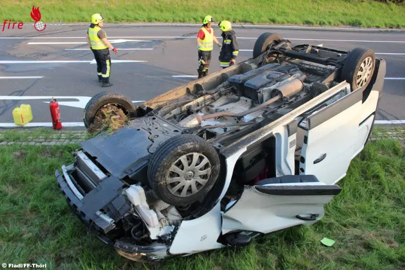 Sofort rückten 15 Kameraden der Feuerwehr zum Einsatzort aus. Dort eingetroffen fand man einen beschädigten Pkw an der Kreuzung nach Aflenz, sowie einige Meter danach ein Auto am Dach liegend vor. Nach Absicherung und Erkundung der Unfallstelle stellte sich heraus, dass sich die vermutlich eingeklemmte Person aus eigener Kraft aus dem Fahrzeug befreien konnte.