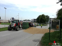SCHWERTBERG (OÖ): Um 07:45 Uhr des 10. August 2017 wurde die Freiw. Feuerwehr Schwertberg zu Aufräumarbeiten nach Verkehrsunfall alarmiert. Ein mit Dinkel beladener Anhänger stürzte Höhe Unimarkt bei der Ausfahrt aus dem Kreisverkehr um.