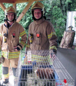 Umgehend wurde vom Angriffstrupp des Hilfeleistungslöschfahrzeuges der Zentralfeuerwache ein C-Rohr unter schwerem Atemschutz zur Brandbekämpfung vorgenommen. Zeitgleich erfolgte die Suche nach dem Meerschweinchen im ersten OG durch den Atemschutztrupp des Rüstlöschfahrzeuges der Wache Süd. Erfreulicherweise konnte das Tier binnen weniger Minuten aufgefunden und unverletzt seiner Besitzerin übergeben werden.