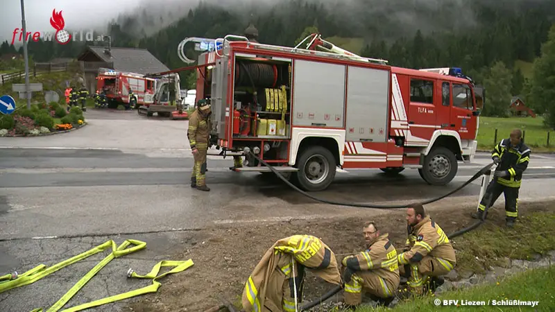 Betroffen von den Starkregenereignissen der letzten Stunden ist auch der BFV Liezen, wo im Großraum Liezen rund 200 Feuerwehrkräfte im Einsatz stehen.