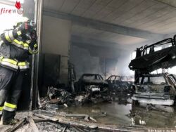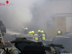 Bei Eintreffen der Einsatzkräfte ergab sich folgendes Lagebild: Werkstättengebäude in Vollbrand, Brandübertritt auf Fahrzeuge vor der Werkstätte, Gefahr von Gasflaschen in der Werkstätte sowie eine verletzte Person vor dem Gebäude, die bereits vom Roten Kreuz versorgt wurde. Durch einen umfassenden Löschangriff unter Umluft unabhängigen Atemschutz, konnte ein Übergreifen auf die Nebengebäude, sowie die Brandausbreitung im Bereich der Fahrzeuge vor der Werkstätte verhindert werden.