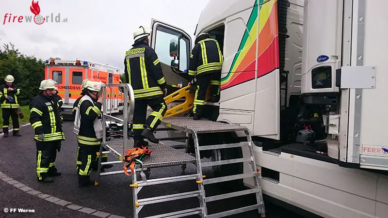 WERNE (DEUTSCHLAND): Um 13:33 Uhr wurden am 11. August 2017 die beiden Rüstzüge der Freiwilligen Feuerwehr Werne (Löschzug 1, Stadtmitte) und der Freiwilligen Feuerwehr Bergkamen (Löschgruppe Rünthe) zu einem nicht alltäglichen Einsatz zur Unterstützung des Rettungsdienstes und der Notärztin aus Werne alarmiert. Am Autohof war ein adipöser Lkw-Fahrer an einer Blutvergiftung in Verbindung mit einer Thrombose in seinem Sattelschlepper erkrankt und konnte das Fahrzeug nicht mehr selbstständig verlassen.