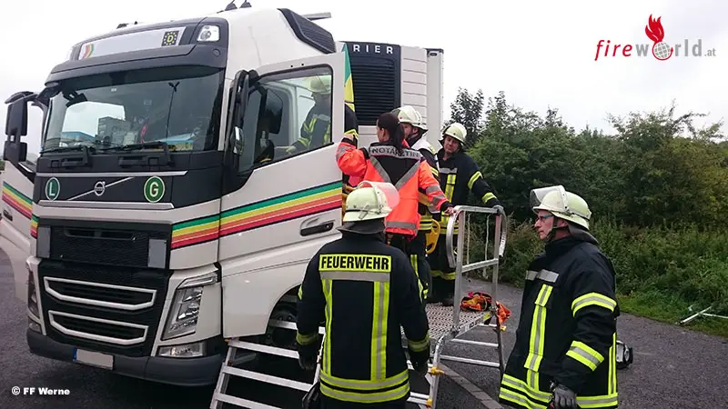 WERNE (DEUTSCHLAND): Um 13:33 Uhr wurden am 11. August 2017 die beiden Rüstzüge der Freiwilligen Feuerwehr Werne (Löschzug 1, Stadtmitte) und der Freiwilligen Feuerwehr Bergkamen (Löschgruppe Rünthe) zu einem nicht alltäglichen Einsatz zur Unterstützung des Rettungsdienstes und der Notärztin aus Werne alarmiert. Am Autohof war ein adipöser Lkw-Fahrer an einer Blutvergiftung in Verbindung mit einer Thrombose in seinem Sattelschlepper erkrankt und konnte das Fahrzeug nicht mehr selbstständig verlassen.