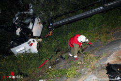 Er musste daher von den Feuerwehrmitgliedern in einem Rettungskorb fixiert und danach mit Seilen über die steile Uferböschung nach oben gezogen werden, bevor er von den bereits anwesenden Notfallsanitätern bzw. einem Arzt medizinisch versorgt werden konnte. Trotz der raschen Hilfe verstarb der Lenker noch an der Unfallstelle. Nach Abschluss der polizeilichen Ermittlungen wurde das auf der Uferböschung zu liegen gekommene Unfallfahrzeug mit einem Kranfahrzeug geborgen und die Fahrbahn der B 57 von Glassplittern und abgebrochenen Fahrzeugteilen gesäubert.