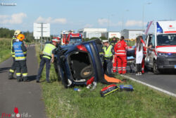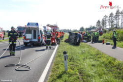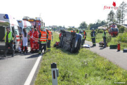 Laut ersten Informationen war ein Fahrzeug allein in den Unfall verwickelt. Die Fahrzeuglenkerin verlor aus bisher unbekannter Ursache die Kontrolle über ihr Fahrzeug, kam von der Fahrbahn ab und seitlich liegend zum Stillstand. Glücklicherweise war entgegen ersten Meldungen niemand im Fahrzeug eingeklemmt. Die Feuerwehr unterstützte den Rettungsdienst bei der Versorgung der Verletzten. Die zwei Verletzten wurden vom Rettungsdienst sowie dem Team des Notarzthubschraubers Martin 3 erstversorgt und anschließend ins Krankenhaus transportiert. Die Feuerwehr führte anschließend die Aufräumarbeiten an der Unfallstelle durch. Der Verkehr wurde langsam an der Unfallstelle vorbeigeleitet.