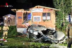 Ein Pkw war mit drei jungen Männern aus ungeklärter Ursache ins Schleudern geraten und von der Bundesstraße abgekommen. Durch den Aufprall auf die Böschung einer Nebenstraße katapultierte das Fahrzeug in die Höhe und schlug am Dach eines Imbissstandes ein. Nachbarn, Zirkusleute und Passanten kümmerten sich sofort vorbildlich um die verunfallten Personen. Auch die Rettungskräfte – Rotes Kreuz, Polizei und Feuerwehr – waren innerhalb kurzer Zeit vor Ort und leisteten Erste Hilfe.