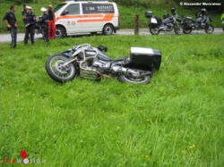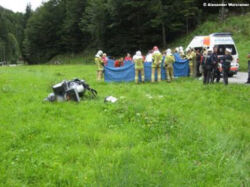 KIRCHDORF (TIROL): Am Samstagnachmittag, 12. August 2017, wurde die Feuerwehr Kirchdorf um 13.51 Uhr mittels Pager Sammelruf zu einem Verkehrsunfall alarmiert. Rettungsmannschaften vom Rettungsdienst Tirol sowie der Besatzung des Notarzthubschrauber Christopherus 4 reanimierte einen Motorradfahrer, der auf der regennassen Fahrbahn ausgerutscht ist und gegen einen neben der Fahrbahn befindlichen Drahtzaun schlitterte.