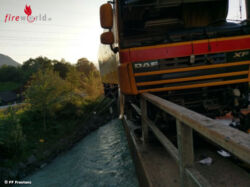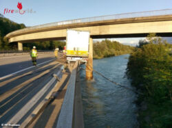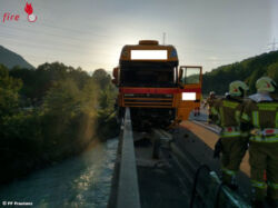Vbg: Sattelschlepper hängt nach Unfall auf der A14 auf Leitplanke halbseitig über Fluss