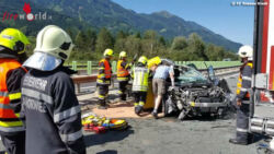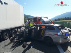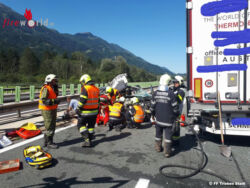 TRIEBEN (STMK): Um 09:07 Uhr des 15. August 2017 wurde die FF Trieben zu einem schweren Verkehrsunfall auf die A9 alarmiert. Ein Pkw mit Anhänger verunfallte auf der A9 zwischen Trieben und Rottenmann. Aufgrund der Alarmmeldung „eingeklemmte Person“ wurde die FF Gaishorn mit zweitem Rettungsgerät mitalarmiert.