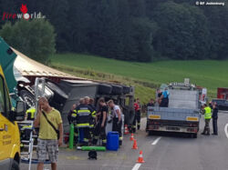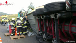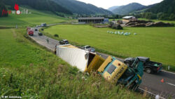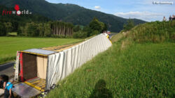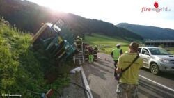 MÖDERBRUGG (STMK): Am Donnerstag, dem 17.08.2017, wurden die Feuerwehren Möderbrugg und Oberzeiring gegen 16.40 Uhr zu einem Verkehrsunfall auf die B114 Höhe Möderbrugg alarmiert. Aus ungeklärter Ursache stürzte ein mit Holzspannplatten beladener Sattelschlepper um.
