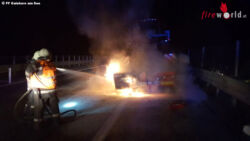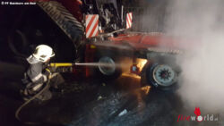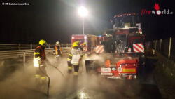 Sofort setzte sich der gesamte Fuhrpark der Wehr in Richtung Autobahn in Bewegung, dabei war bereits auf der Anfahrt ein Feuerschein erkennbar. Das MTFA als ersteintreffendes Fahrzeug begann unter Zuhilfenahme von Handfeuerlöschern unverzüglich mit der Eindämmung des Brandes im Bereich der hinteren Reifen am Anhänger – so konnten die Flammen niedergehalten werden, bis das Rüstlöschfahrzeug kurze Zeit später den weiteren Angriff mittels Hochdruck-Rohr übernahm.