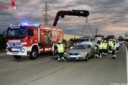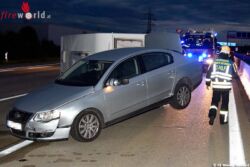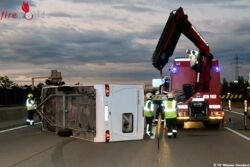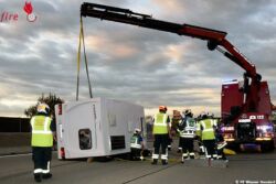 Nach Ankunft der Feuerwehr mit vier Fahrzeugen und 14 Mann am Einsatzort bot sich folgende Lage: Ein umgestürzter Wohnwagenanhänger sowie das mit der Hinterachse in der Luft stehende Zugfahrzeug am 3. und 4. Fahrstreifen. Die unverletzte Familie befand sich zu diesem Zeitpunkt bereits außerhalb ihres Pkw und erwartete die Einsatzkräfte.