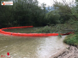 Sofort wurden bei der Einmündung des Baches in die Traun mehrere HP100 Rollen platziert, um nachkommendes Öl aufzufangen. In der Zwischenzeit wurden im Bereich Seewinkel die Ölsperren aufgebaut und mit dem A-Boot zur Traun gezogen.