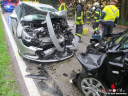 Während am Nachmittag eine große Esche, die auf eine Glasfassade und das Hausdach gestürzt war, für die Bergung mit dem Kran des Rüstfahrzeugs vorbereitet wurde, kam die Alarmierung zu einem Verkehrsunfall auf der B132.Sofort rückten die Kamerad/innen dorthin aus. Zwei Pkw waren frontal zusammengestoßen und beide schwerverletzte Lenker saßen noch in ihren Fahrzeugen, waren aber nicht eingeklemmt. Während wir mit der Betreuung der Verletzten und Absicherung der Unfallstelle begannen, trafen auch schon die Rettungskräfte des Samariterbundes Feldkirchen und des Roten Kreuzes Walding ein. Gemeinsam mit der FF Lacken sperrten wir die B132 und beseitigten ein mehrere hundert Meter lange Ölspur im Bereich der Unfallstelle. Noch während die Aufräumarbeiten in Gang waren, rückte das Rüstfahrzeug mit Kran zum Objekt mit der umgestürzten Esche ab, da diese auf die Glasfassade drückte. Mit dem Kran konnte der Baum in mehreren Teilen über das Haus hinweg geborgen werden, ohne weitere Beschädigung zu verursachen. Um 20:00 Uhr konnte die FF Bad Mühllacken diesen einsatzreichen Tag abschließen. Zu den 11 Einsätzen waren insgesamt 103 Kamerad/innen ausgerückt.
