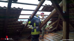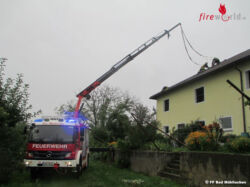 Ab 7:30 Uhr war dann die FF Bad Mühllacken den ganzen Tag bis 20:00 Uhr im Einsatz. Zuerst galt es einen umgestürzten Baum, der die Zufahrt auf den Sechterberg versperrte, zu entfernen. Danach meldeten sich mehrere Hausbesitzer, dass ihre Dächer teilweise abgedeckt seien. Da weiterer Regen angekündigt wurde, wurden diese Einsätze vorgezogen und mit den meist vorhandenen Reservedachziegeln konnten alle Dächer wieder komplett dicht gemacht werden. Danach galt es noch gemeinsam mit der Energie AG Bäume bzw. Äste , die in Stromleitungen hingen, zu entfernen. So wie auch den ganzen Tag bewährte sich hier das neue Rüstfahrzeug mit dem Kran samt Arbeitskorb.