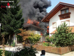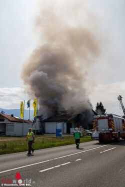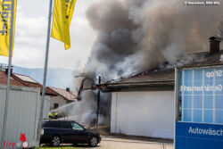 FELDKIRCHEN (BAYERN): Gegen 12.30 Uhr des 22. August 2017 wurde über Notruf der Brand eines Autos in einer Werkstätte an der B20 bei Feldkirchen gemeldet. Bereits auf der Anfahrt sahen die Einsatzkräfte eine dichte Rauchsäule aufsteigen, wobei das Feuer bereits auf weitere Gebäudeteile und den Dachstuhl übergegriffen hatte.