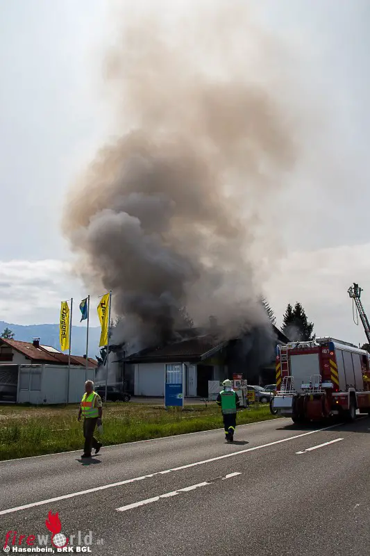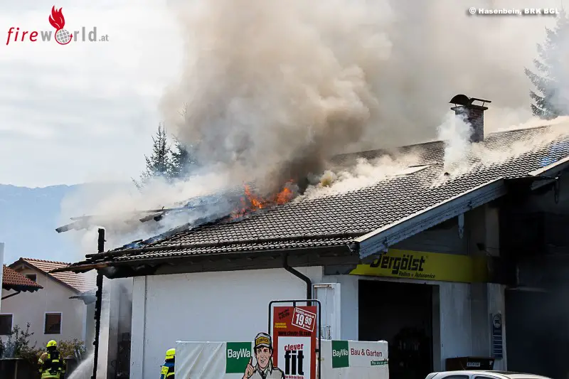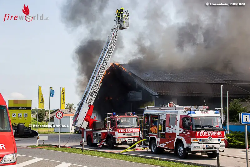 FELDKIRCHEN (BAYERN): Gegen 12.30 Uhr des 22. August 2017 wurde über Notruf der Brand eines Autos in einer Werkstätte an der B20 bei Feldkirchen gemeldet. Bereits auf der Anfahrt sahen die Einsatzkräfte eine dichte Rauchsäule aufsteigen, wobei das Feuer bereits auf weitere Gebäudeteile und den Dachstuhl übergegriffen hatte.
