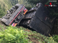 MAUTERN (STMK): Am Montag, dem 21. August 2017 wurden die Einsatzkräfte zu einem Verkehrsunfall mit einem Lkw in die Magdwiesen alarmiert. Der unbeladene Lastkraftwagen für Hackschnitzel kam kurz nach 16:00 Uhr von einer Forststraße in der Magdwiesen in Mautern ab und stürzte über eine steile Böschung.