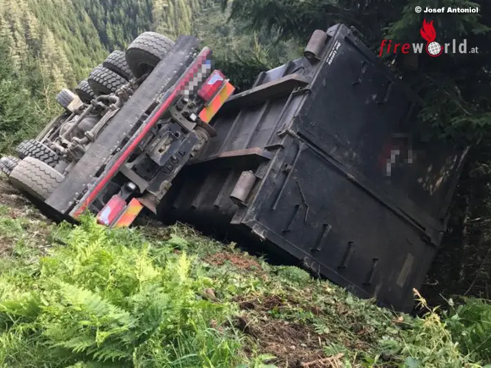 MAUTERN (STMK): Am Montag, dem 21. August 2017 wurden die Einsatzkräfte zu einem Verkehrsunfall mit einem Lkw in die Magdwiesen alarmiert. Der unbeladene Lastkraftwagen für Hackschnitzel kam kurz nach 16:00 Uhr von einer Forststraße in der Magdwiesen in Mautern ab und stürzte über eine steile Böschung.