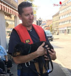 AUGSBURG (BAYERN): Gegen 11:20 Uhr des 23. August 2017 der Wasserrettungszug der Berufsfeuerwehr Augsburg an den Hettenbach im Bereich der Donauwörther Straße alarmiert. Ein Hund war ins Wasser geraten und schaffte es aufgrund der betonierten Wände nicht wieder heraus.