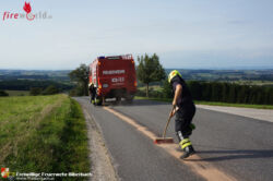 BIBERBACH (NÖ): Am frühen Abend des 22. August 2017 wurden die Mitglieder der Feuerwehr Biberbach neuerlich zur Beseitigung einer Ölspur alarmiert. Auf der L6200 hatte ein Pkw aufgrund eines technischen Gebrechens Nähe Maaberg Öl verloren und zog dabei eine rund 200 m lange Ölspur. Ein Anrainer alarmierte die Einsatzkräfte.