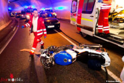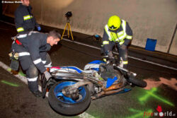 ZWISCHENWASSER (VBG): Schwere Verletzungen haben sich zwei Motorradfahrer bei einer Streifkollision am Mittwoch, 23. August 2017, in Batschuns-Zwischenwasser zugezogen. Im Schwarze-Rüfe-Tunnel streiften sich die Fahrzeuge, beide Fahrer kamen zu Sturz.