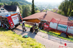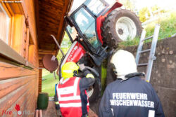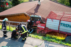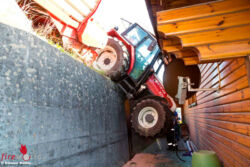Vbg: Traktorgespann rollt davon und klemmt dann zwischen Hauswand und -dach