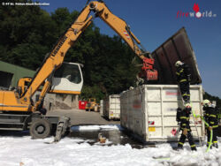 Anschließend wurde das Brandgut mit einem firmeneigenen Bagger angehoben und gründlich nachgelöscht. Gerade die Erstphase dieses Einsatzes war sehr heikel, da nicht genau bekannt war, um welche Stoffe es sich handelt und auch mit weiteren Explosionen und herumfliegenden Trümmern zu rechnen war.