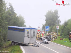 Die 27-Jährige wurde im total demolierten Auto eingeklemmt. Die Straßenrettung der Feuerwehr befreite sie aus dem Wrack. Die Ambulanz brachte sie mit Schnittverletzungen sowie mit Verdacht auf Beckenverletzungen ins Spital. Die beiden auf dem Anhänger geladenen Rinder blieben unverletzt. Sie wurden im Zuge der Rettungsarbeiten auf einen anderen Transporter umgeladen und weggeführt. Neben dem Ford, an dem Totalschaden entstand, wurden auch der Anhänger und das Zugfahrzeug beschädigt.