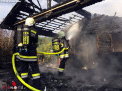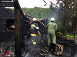 Nachdem der Brand unter Kontrolle gebracht werden konnte, musste die abgebrannte Hütte ausgeräumt werden, um alle Glutnester abzulöschen und so einen erneuten Brandausbruch zu verhindern. Besondere Gefahr für die eingesetzten Feuerwehrmitglieder bestand durch im Schuppen gelagerte Gasflaschen, sowie durch die Einsturzgefahr der ausgebrannten Hütte.