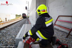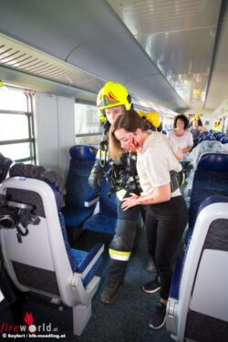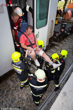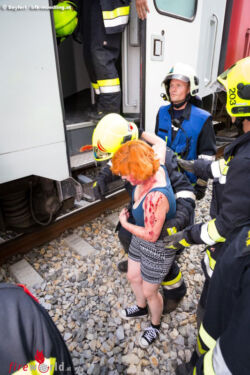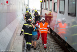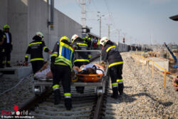 Im Übungsszenario wurde somit ein Atemschutztrupp in die Waggons geschickt, während gleichzeitig vorsorglich ein Brandschutz (einsatzbereite Schlauchleitung) errichtet wurde. Während die Kameraden der Feuerwehren Kontakt zu allen Verletzten herstellten und eine Erstversorgung im Waggon durchgeführt wurde, erstellte man gemeinsam mit dem Roten Kreuz eine Transportkette, die den sicheren und schnellen Abtransport aller Verletzten garantierte. Mithilfe eines Zugschlittens, wurden die verletzten Personen dann zum Bahnhofsgebäude gebracht und für den weiteren Transport sowie für die weitere medizinische Versorgung vorbereitet.