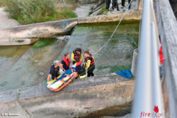 Nach dem Transport über den Wasserüberlauf übergaben die herbeigerufenen Kollegen der Wassernoteinheit an die Besatzung des Hilfeleistungslöschfahrzeuges. Diese trugen die Patientin zurück ans Ufer wo sie die Rettungsdiensbesatzung bereits erwartete. Sie wurde zur weiteren medizinischen Untersuchung in eine Münchner Klinik transportiert. Der Hund hatte sich in der Zwischenzeit wieder selbst aus dem Wasser begeben.
