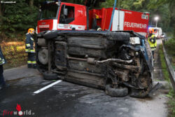 THALHEIM BEI WELS (OÖ): Ein Verkehrsunfall mit Fahrzeugüberschlag auf der Traunuferstraße in Thalheim bei Wels (Bezirk Wels-Land) forderte Dienstagfrüh, 29. August 2017, zwei Verletzte. Zwei Pkw waren in den Unfall verwickelt, eines davon kam am Dach liegend zum Stillstand.
