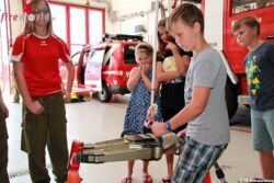 An verschiedenen Stationen lernten die Kinder die Geräte der Feuerwehr kennen und durften diese auch selbst ausprobieren. Gestartet wurde mit der Besichtigung der Fahrzeuge und einer kleinen Einführung über Geräte, Einsatzkleidung und die richtige Alarmierung von Feuerwehr, Polizei und Rettung.